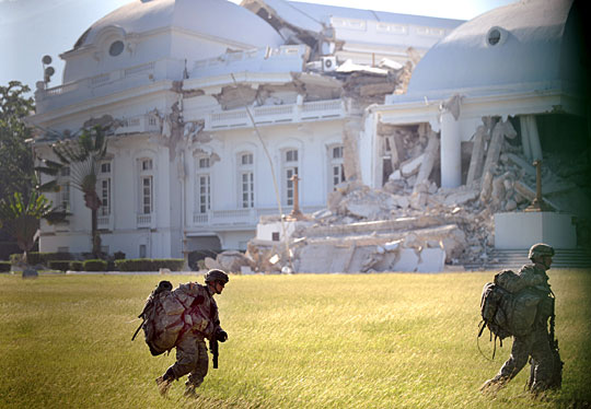 圖為美軍士兵正在徒步通過被地震嚴重損毀的海地總統府前的草坪。