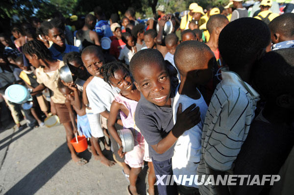 1月20日,在海地首都太子港,孩子們排隊領(lǐng)取食物。 1月12日,海地發(fā)生里氏7.3級地震,造成人員傷亡和重大財產(chǎn)損失。國際社會紛紛伸出援手,向海地提供人道主義援助。新華社/法新