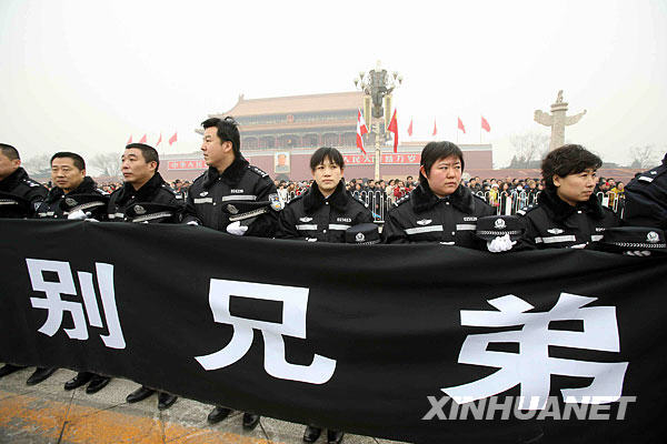 1月19日,專程接運在海地地震災害中遇難的八位中國維和警察靈柩的專機抵達北京。這是警察和群眾在長安街上送別烈士靈柩。新華社記者 汪永基 攝