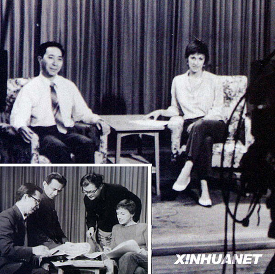 上圖:1982年,主持人凱瑟琳(右)和胡仲文在《跟我學》一次節目的錄制現場;下圖:1982年,在一次《跟我學》節目錄制前,主持人和導演、編導一起商量腳本(合成圖片)。