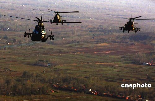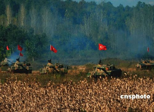 2008年10月24日,中國人民解放軍濟南軍區參加“前鋒--2008”演習部隊在訓練基地集結完畢,裝甲、陸航部隊進入訓練階段。這次演習以信息化條件聯合作戰為背景,進行實兵、實彈演練,將有二百余名外國軍人、留學生參觀。據悉,這是中國軍隊首次大規模對外國留學生開放軍事訓練演習。 中新社發 宋吉河 攝