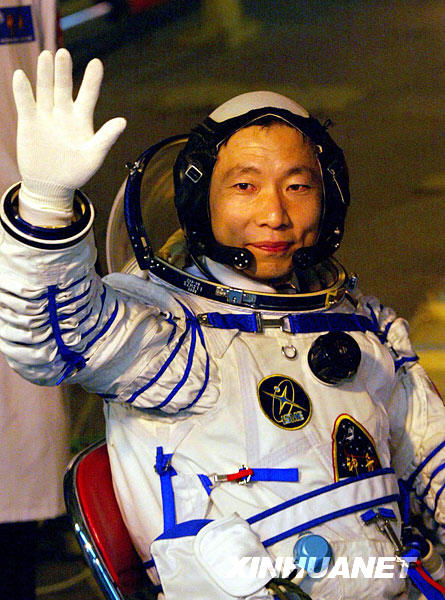 這是2003年10月15日,執行中國首次載人航天飛行任務的航天員楊利偉出發登艙前揮手致意。新華社發