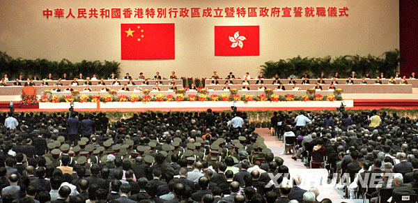 1997年7月1日0時0分0秒,中國政府恢復(fù)對香港行使主權(quán)。這是當(dāng)日凌晨,中華人民共和國香港特別行政區(qū)成立暨特區(qū)政府宣誓就職儀式在香港會議展覽中心新翼七樓隆重舉行。新華社發(fā)