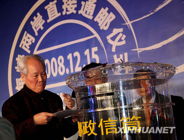 2008年12月15日,出生在臺灣的鄭堅老先生在北京舉行的兩岸直接通郵儀式上投寄出寄往臺灣的家書。當(dāng)日,眾望所歸的兩岸海運(yùn)直航、空運(yùn)直航以及直接通郵正式啟動,兩岸同胞魂牽夢縈的直接“三通”得以基本實現(xiàn)。新華社發(fā)