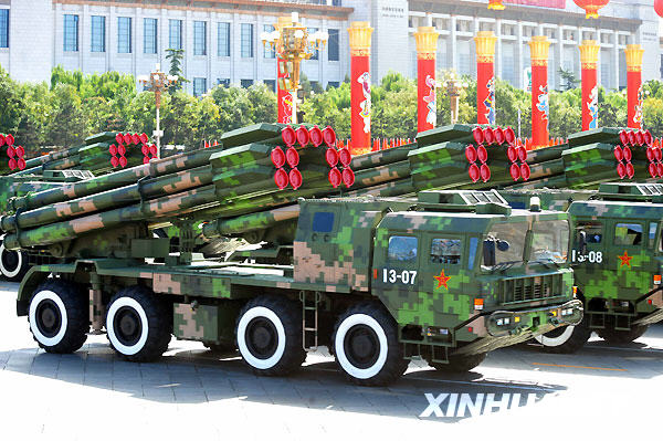 10月1日,首都各界慶祝中華人民共和國成立60周年大會(huì)在北京舉行。這是遠(yuǎn)程火箭炮方隊(duì)通過天安門廣場。新華社記者李曉果攝