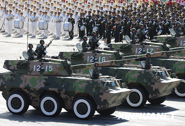 10月1日,首都各界慶祝中華人民共和國成立60周年大會(huì)在北京天安門廣場舉行。這是輪式自行突擊炮方隊(duì)通過天安門廣場。新華社記者郭大岳攝
