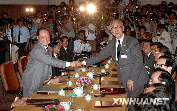 1993年4月,海峽兩岸兩個民間團(tuán)體的領(lǐng)導(dǎo)人汪道涵和辜振甫在新加坡會晤。這是1993年4月27日,海峽兩岸關(guān)系協(xié)會會長汪道涵(左)與海峽兩岸交流基金會董事長辜振甫首次會談前握手。新華社發(fā)