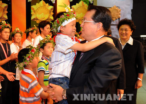6月27日,中共中央政治局常委李長春在“抗震救災英雄少年”頒獎晚會上與獲獎少年合影留念。 當日,“抗震救災英雄少年”頒獎晚會——《英雄少年》在中央電視臺舉行。中共中央政治局常委李長春出席頒獎晚會并為“抗震救災英雄少年”頒獎。 新華社記者 李濤 攝