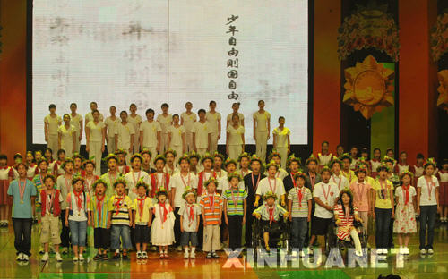 6月27日,獲得抗震救災“英雄少年”稱號的孩子們在演唱歌曲《英雄少年》。 當晚,2008抗震救災英雄少年頒獎晚會在北京舉行。 新華社記者 高潔 攝