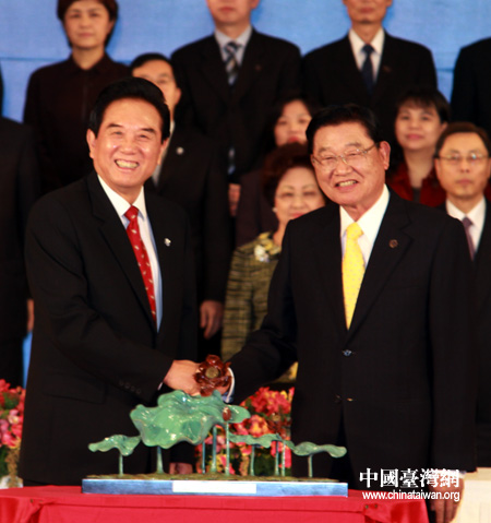 12月21日下午,海協會會長陳云林與海基會董事長江丙坤正式簽署《海峽兩岸醫藥衛生合作協議》,雙方并在協議簽署后互贈禮品。圖為海協會致贈海基會方面的雕塑作品《好事連連》。(中國臺灣網 鐘寶華 攝)