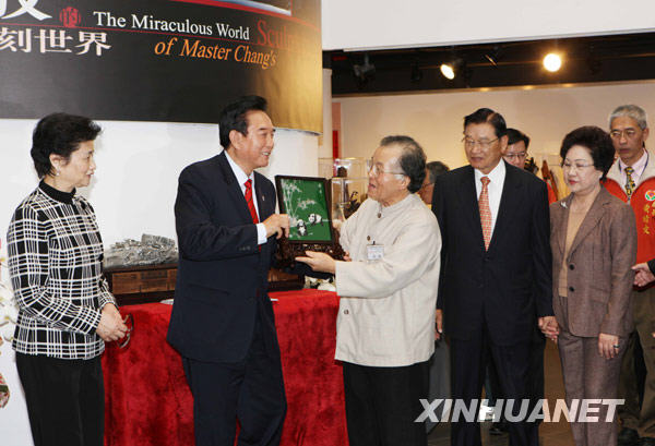 12月23日,海協(xié)會(huì)會(huì)長(zhǎng)陳云林(左二)在參觀木雕作品后與雕刻大師張敬互換紀(jì)念品。