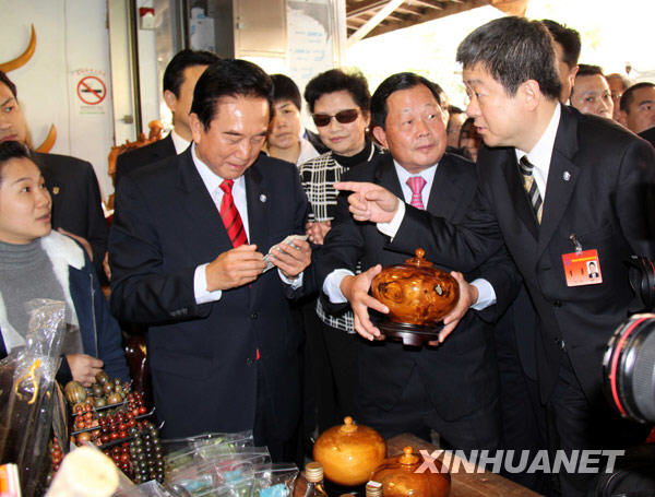 12月23日,海協(xié)會(huì)會(huì)長(zhǎng)陳云林(前左二)參觀三義木雕博物館后,來(lái)到博物館邊的工藝小店,購(gòu)買當(dāng)?shù)靥厣镜窆に嚻贰P氯A社記者 徐群 攝