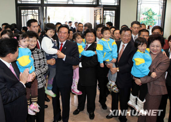 12月23日,海協會會長陳云林與夫人在;鶗麻L江丙坤夫婦的陪同下來到臺中縣的一所兒童家園,看望在這里生活的孩子。新華社發(王濤攝)