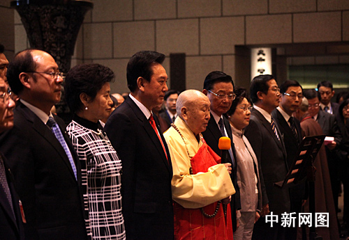 12月24日,臺灣中臺禪寺主持惟覺法師親自歡迎大陸海協會會長陳云林一行到訪。圖為惟覺法師誦經祈求兩岸和平,繁榮發展。