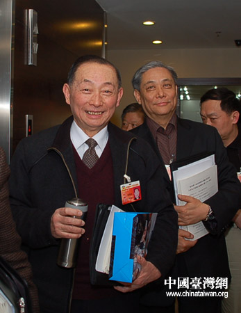 著名京劇表演藝術(shù)家梅葆玖(左)抱著一摞資料剛從小組討論會場出來。