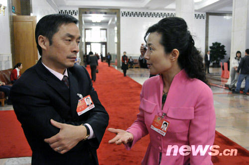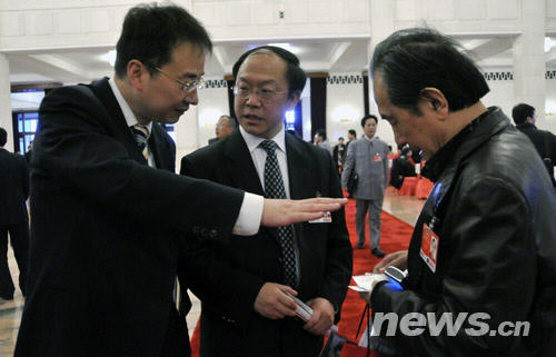 3月9日,全國政協十一屆二次會議在人民大會堂舉行第四次全體會議,委員進行大會發言。圖為兩位政協委員進入會場前在進行交談。陳濤 攝