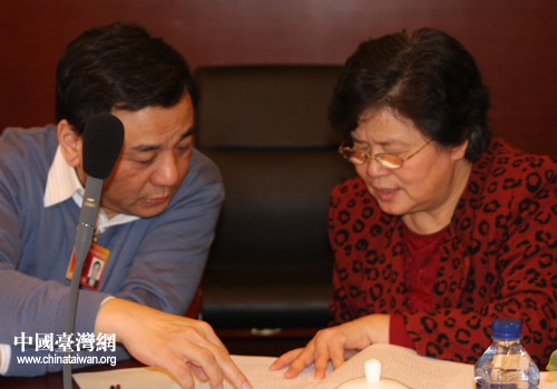 臺聯(lián)界別委員蔡國斌與簡少玉一起探討政府工作報告。(中國臺灣網(wǎng) 高斯斯 攝)