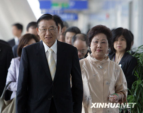 4月29日,江丙坤(左)和夫人陳美惠準備登機返臺。當日,由臺灣海基會董事長江丙坤率領的海基會協商代表團從上海浦東國際機場啟程返回臺灣。新華社記者邢廣利 攝