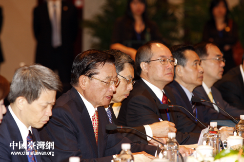 海基會董事長江丙坤(左二)致辭。26日上午9時,海峽兩岸關系協會會長陳云林與海峽交流基金會董事長江丙坤第三次會談在南京紫金山莊正式舉行。(中國臺灣網 鐘寶華 攝)