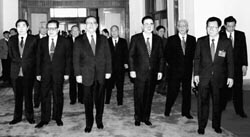 1998年3月3日,中國人民政治協商會議第九屆全國委員會第一次會議在北京人民大會堂隆重開幕。江澤民、李鵬、喬石、朱镕基、李瑞環、劉華清、胡錦濤、尉健行、李嵐清、榮毅仁等領導同志步入會場。新華社記者劉建國攝