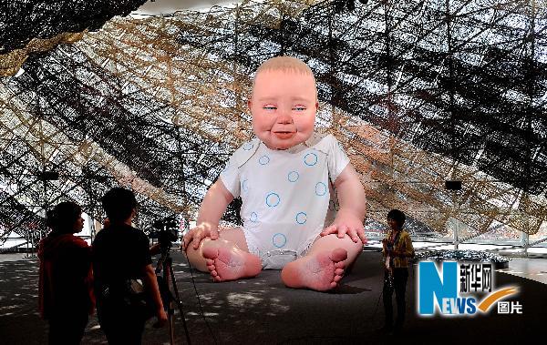 5月1日,在上海世博園西班牙館,坐高6.5米的“西班牙國家館的孩子”--吉祥物“米格林”注視著飄在空中的肥皂泡。新華社記者吳曉凌攝