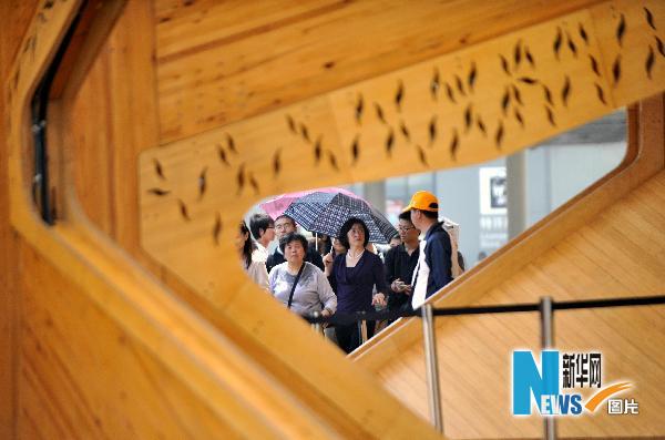 這是由木結(jié)構(gòu)組成的挪威館外立面(5月2日攝)。新華社記者朱崢攝
