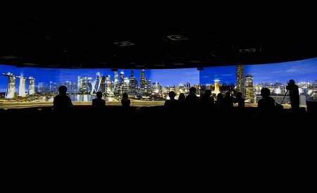 4月24日,上海世博園區,試運營中的2010 年上海世博會新加坡館中影音室里四格屏幕正在播放新加坡館主題MV。早報記者 魯海濤 圖