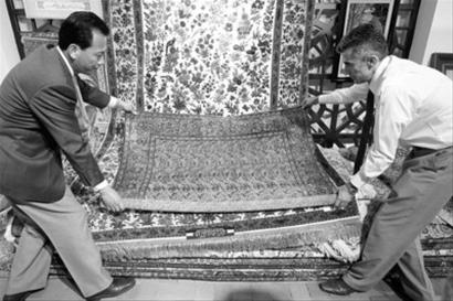 這僅是Sabery“壓箱底”寶貝中的一塊。在記者的堅持下,Sabery從角落里翻出一只木箱,小心翼翼地打開后,又拉開罩在上面的布包,記者這才看到一塊非常古樸精致的地毯。這塊地毯上的圖案都是規則的幾何形狀,雖然有著200年以上的歷史,圖案依然鮮明清晰,沒有任何損害。Sabery告訴記者,從這塊地毯的做工來看,它以前一定屬于某個貴族,但究竟是誰,還無從考證。從地毯上的簽名來看,它應該是伊朗卡山地區一位叫做阿赫巴巴也(音譯)的地毯世家制作,內行一看便知是極品中的極品,而它的價值至少也在700萬元以上。(陳文)