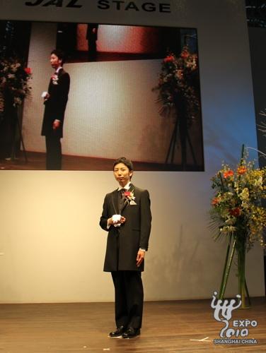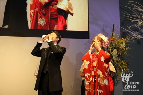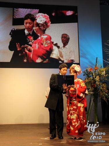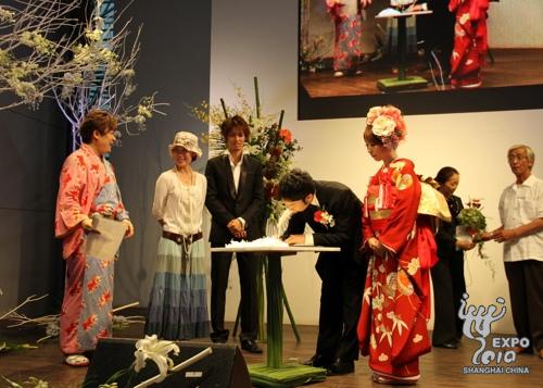 日本產業館JAL舞臺上,來自橫濱的新郎岡陽介身穿西式禮服首先登場。之后,同樣來自橫濱的新娘岡美緒身著正紅色、由3層衣服組成的日本傳統服飾――和服,腳踩木屐,在父親的引領下出現在觀眾面前。在兩位新人宣讀誓言、喝下交杯酒后,一位現場觀眾被邀請上臺作為證婚人之一,和新娘父母、主持人、歌手小松拓也一起在結婚證明書上簽字,見證兩人的結合。隨后,新人互換戒指,新郎向新娘送上深情一吻,至此,兩位新人正式結為夫婦,而現場觀眾也在此時送上了陣陣掌聲和祝福。