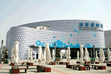 由中國移動與中國電信聯合建設的信息通信館坐落于浦西園區,遠望宛若一座雪域城堡。其外墻通體采用LED覆蓋,成為世博會為數不多的可以整體變換“外衣”的展館之一。白天,由6400塊蜂窩狀板材構成的外觀藍白交替,無轉角設計形成流暢的線條,充滿簡潔之美。當華燈初上,夜色中的信息通信館忽然“華麗轉身”,其LED外墻整體發光,且色彩時刻都在變化,仿佛披上了一襲七彩華服,流光溢彩之間與浦江夜景相映生輝。