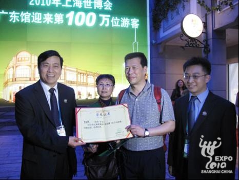 6月9日上午10點,2010年上海世博會廣東館迎來了開館以來的第100萬名參觀者——來自湖北省十堰市的嚴(yán)先生。廣東省貿(mào)促會副會長、廣東館副館長司慶偉向這名幸運游客頒發(fā)榮譽證書,并贈送了一輛自行車以鼓勵他綠色出行。