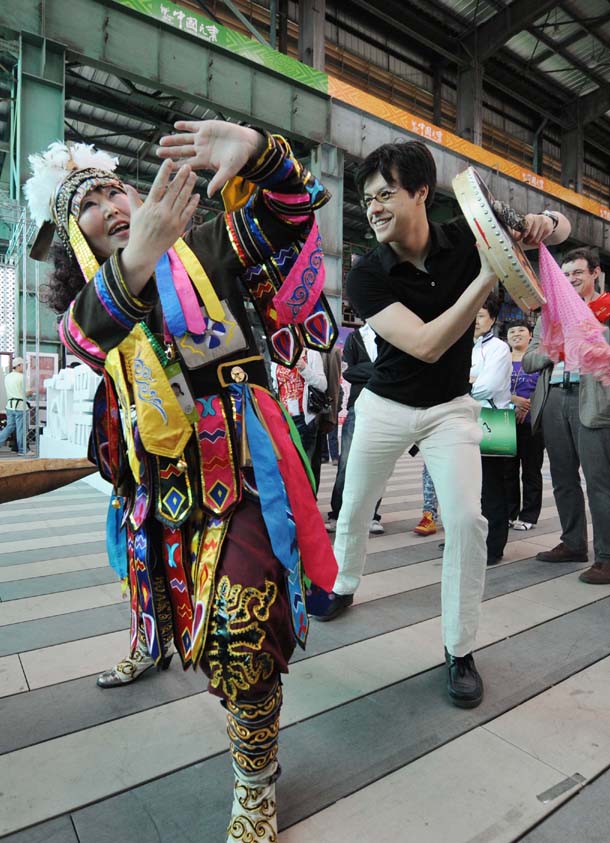 6月10日,在中國元素傳習區,丹青在向赫哲族藝人學習薩滿舞。新華社記者 王建威 攝