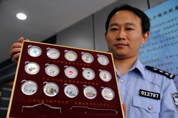 6月28日,民警展示假冒世博會紀念商品。新華社記者 李文 攝