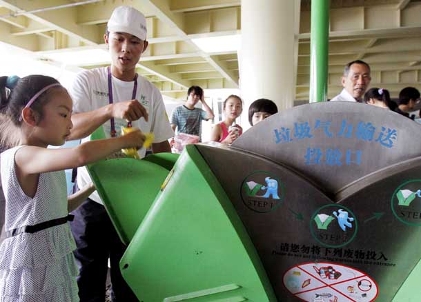 一種非常先進的垃圾收集方法——“智能化垃圾氣力輸送系統”已在上海世博園內運行使用。這套高科技系統吞食垃圾的“嘴巴”——51個外觀形似嫩芽的智能化垃圾投放口分布在“一軸四館”范圍內,但尚未被游客廣泛認識。為了讓游客更好地了解和使用,工作人員在園區內進行宣傳和演示,使游客對園區的高科技和環保設施有了更深的了解。