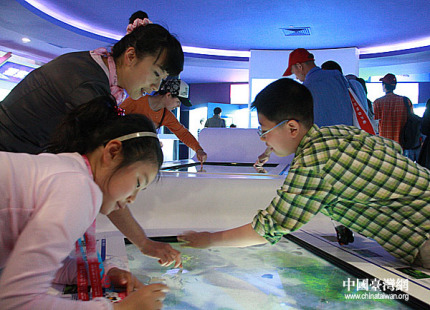 臺北館內,孩子們通過觸摸屏體驗,讓淡水河在自己手中變得清澈(中國臺灣網 鐘寶華 攝)