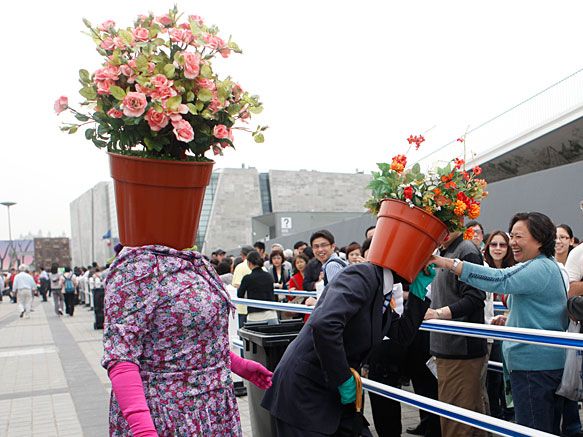 精彩紛呈的世博會(huì),吸引了八方游客前來觀展。穿梭在展館之間的行為藝術(shù)表演,也是觀眾不容錯(cuò)過的節(jié)目。更有觀眾自發(fā)上陣,支持世博,堪稱一絕。圖為在德國館前,行為藝術(shù)表演者吸引眾多觀眾駐足觀賞。(記者:劉歆?攝)