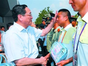 烈日下,俞正聲為世博園區服務保障人員拭去額頭的汗水。周寅杰 現場圖片