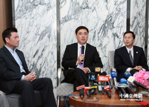 郝龍斌(中)攜臺北市府團隊部分成員在上海舉行記者會,歡迎大陸朋友參觀世博臺北案例館。(中國臺灣網鐘寶華 攝)