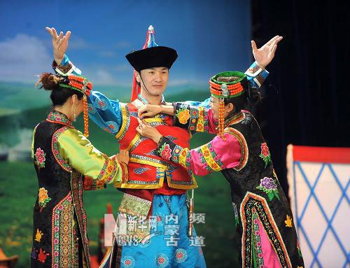 記者:我現在正在位于世博園B區的寶鋼大舞臺,內蒙古的科爾沁婚禮婚俗表演剛剛結束,悠揚的馬頭琴聲,神秘的呼麥(編者注:“呼麥”是圖瓦文xoomei的中文音譯,原義指“喉嚨”,即為“喉音”,一種藉由喉嚨緊縮而唱出“雙聲”的泛音詠唱技法。呼麥又稱“蒙古喉音”。呼麥作為一種歌詠方法,目前主要流傳于中國內蒙古),蒙古舞讓我對蒙古心馳神往,內蒙古科爾沁婚禮的婚俗表演是通過歌舞的形式讓我們了解蒙古族的婚俗,蒙古婚禮跟漢族婚禮有一點是一樣的,新郎要去新娘家接新娘回來,在這個過程中蒙古新郎不像漢族新郎那么幸運,必須接受一次次的考驗,比如射箭,因為是游牧民族,而且為了考驗新郎的力氣必須掰羊脖,這個過程當中,陪娘們(類似于漢族的伴娘)有一些為了戲弄新郎,找一根紅柳棍或者是一根鐵棍子插進羊脖子的骨髓道里,如果新郎事先有指點他當然會識破其中的奧妙取出這個棍子,很容易將羊脖子掰斷,有的新郎不知道秘密,就會非常狼狽。