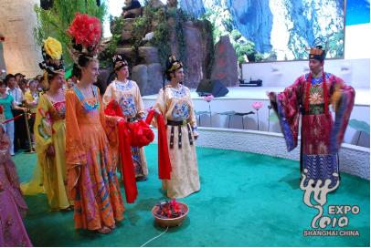 據(jù)悉,此次活動(dòng)是陜西館開(kāi)館以來(lái)舉辦的最大規(guī)模的一次文化活動(dòng),以陜西館形象大使“唐明皇”、“楊貴妃”與陜西華清池《長(zhǎng)恨歌》藝術(shù)團(tuán)的表演及各種互動(dòng)游戲?yàn)橹饕问剑_(kāi)展大唐婚典、愛(ài)的郵遞、明皇賜印、七夕盟誓、投壺比賽等體驗(yàn)活動(dòng),為游客留下歡快、愉悅的美好記憶。(世博網(wǎng))
