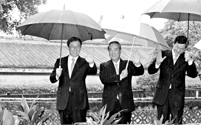 昨天,韓正(左)、親民黨主席宋楚瑜(中)和臺北縣長周錫瑋在林家花園向媒體揮手致意。新華社發