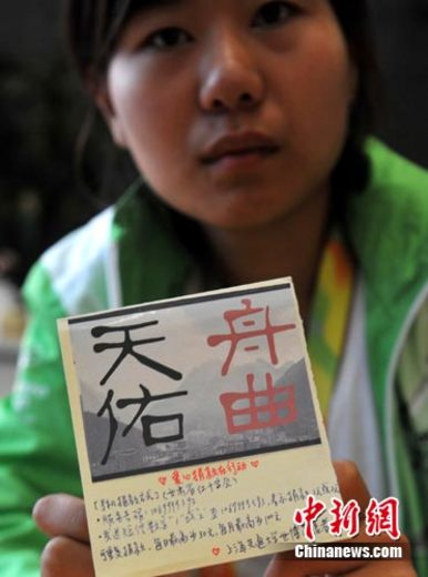 據了解,制作這些卡片是世博志愿者閆藝銘。這位上海交通大學大二學生,7月份剛剛結束了在舟曲的支教活動,當災情傳來,她馬上行動,動員自己的父親和自己一起制作一百張宣傳卡片,而卡片上的風景畫正是閆藝銘在舟曲支教時自己拍攝的。