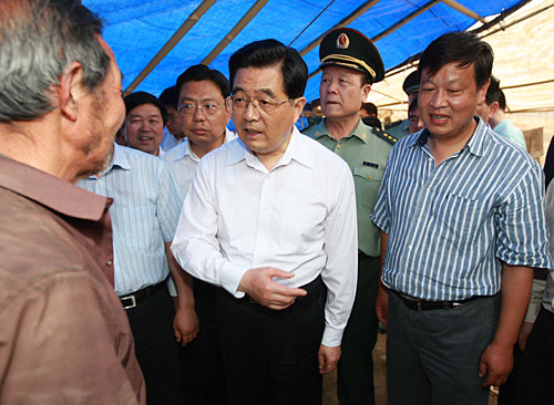 5月31日,中共中央總書記、國家主席、中央軍委主席胡錦濤前往陜西地震重災區(qū)漢中市,察看災情,指導抗震救災工作。這是胡錦濤在寧強縣廣坪鎮(zhèn)金山寺村同受災群眾親切交談。 新華社記者鞠鵬攝