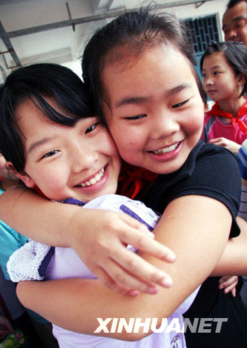 5月24日,四川都江堰市太平街小學同班同學黃緣媛(右)和王文欣,在借讀學校重慶市云陽縣實驗小學重逢,高興地擁抱在一起。新華社發(fā)(饒國君攝)