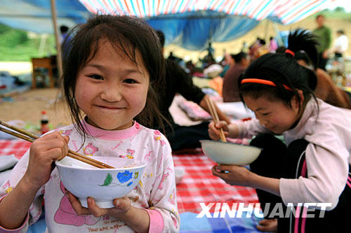 5月13日,兩名小姑娘在陜西省寧強縣青木川鎮(zhèn)輔仁中學安置點吃午餐。新華社記者 陶明 攝