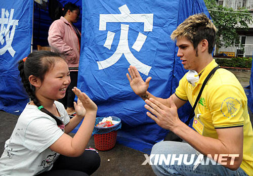 5月21日,一位來自美國的志愿者在四川什邡與受災兒童做游戲。新華社記者 姜帆 攝