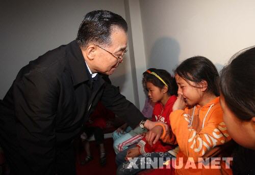 5月13日,溫家寶總理在四川綿陽九洲體育館地震災民安置點看望災民。這是溫家寶安慰在地震中失去親人的孩子們。 新華社記者 姚大偉 攝