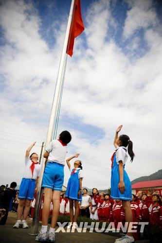 資料圖片:6月23日,在都江堰市過渡校點“皖川學校”,同學們在復課第一天舉行升國旗儀式。
