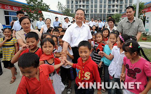 9月2日,溫家寶來到都江堰新建小學(xué)過渡板房學(xué)校看望孩子們時,孩子們簇?fù)碓诳偫砩磉叀?/P>