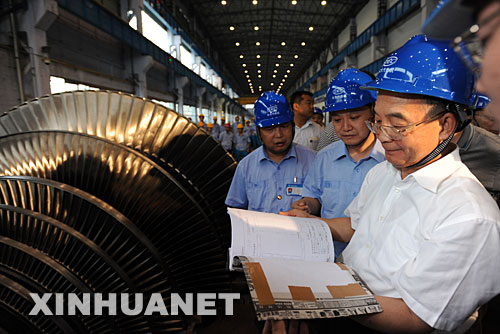 9月1日,溫家寶在德陽市漢旺鎮(zhèn)東方汽輪機廠視察生產(chǎn)恢復(fù)情況。新華社記者 黃敬文攝